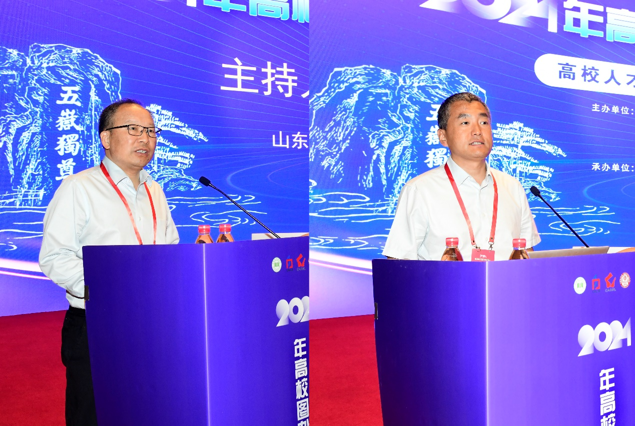 25日上午举办的主论坛一由山东大学图书馆馆长赵兴胜和中国图书馆学会高校图书馆分会副主任委员、大连理工大学图书馆馆长贾明分别主持。陈建龙作《文化育人新质态,智慧服务做先锋》主题报告,从图书馆馆员队伍建设传承创新、用户关系管理集成创新和信息素质教育协同创新、未来学习服务融合创新、坚定文化自信等方面,探索数智时代图书馆发挥文化育人职能的新思路、新方法。四川大学教务处处长党跃武作题为《AI4E背景下AI4L的川大之思》的报告,以四川大学为例,阐释应对新质生产力、人工智能发展要求的新质教育范式,探析AI赋能图书馆的建设思路。赵兴胜分享《价值共创——构建Z世代的高校图书馆用户关系新模式》,以价值共创理念的重要性、山东大学图书馆的探索实践和实施效果为重点,分析高校图书馆的内涵式高质量新发展态势。