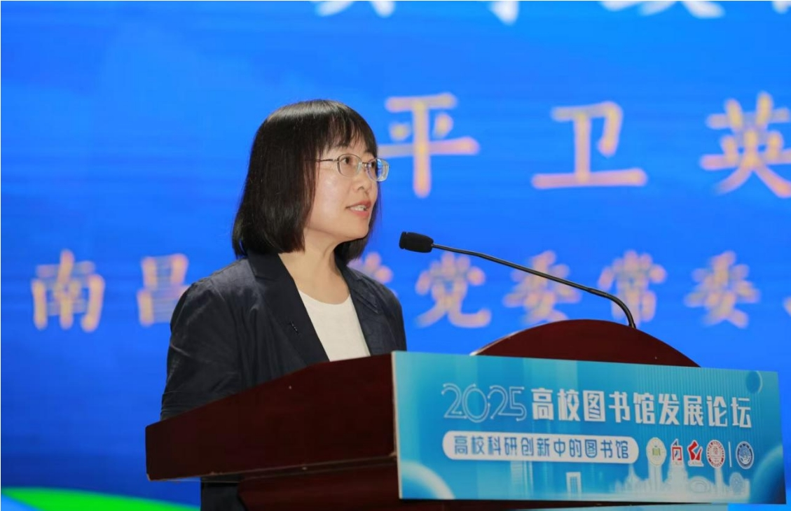 平卫英代表南昌大学欢迎各位领导和嘉宾的到来。她指出,南昌大学以“支撑科研、赋能创新”为导向,推动图书馆从“文献存储”向“智慧引擎”转型,期待在论坛带动下,各高校图书馆深入探索人工智能各项技术应用和图书馆的深度融合,共同抢占“智慧图书馆”的战略制高点。